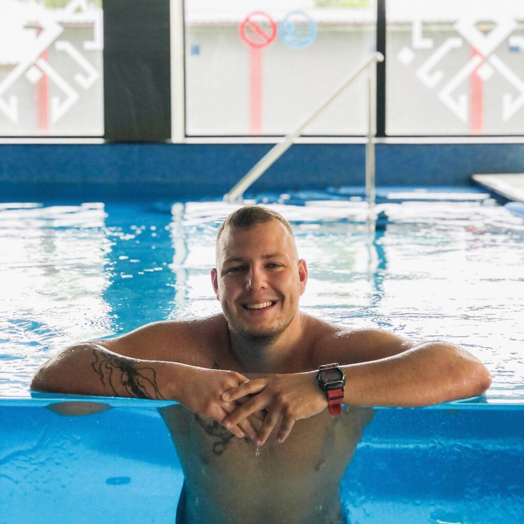 Robert zarządza szkołą od strony organizacyjnej — dopilnowuje grafiku, zajmuje się stroną i marketingiem, rozmawiasz z nim przy zapisie. Wojtek jest na basenie — razem z Anią, Pawłem i Karoliną tworzą zespół, który naprawdę lubi swoją pracę.